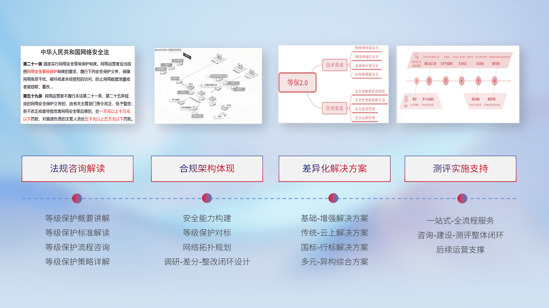 通过专业的法律咨询解读、、合规架构体现、、、差异化解决方案、、测试实施支持等服务,,,为客户量身打造等保合规体系。。